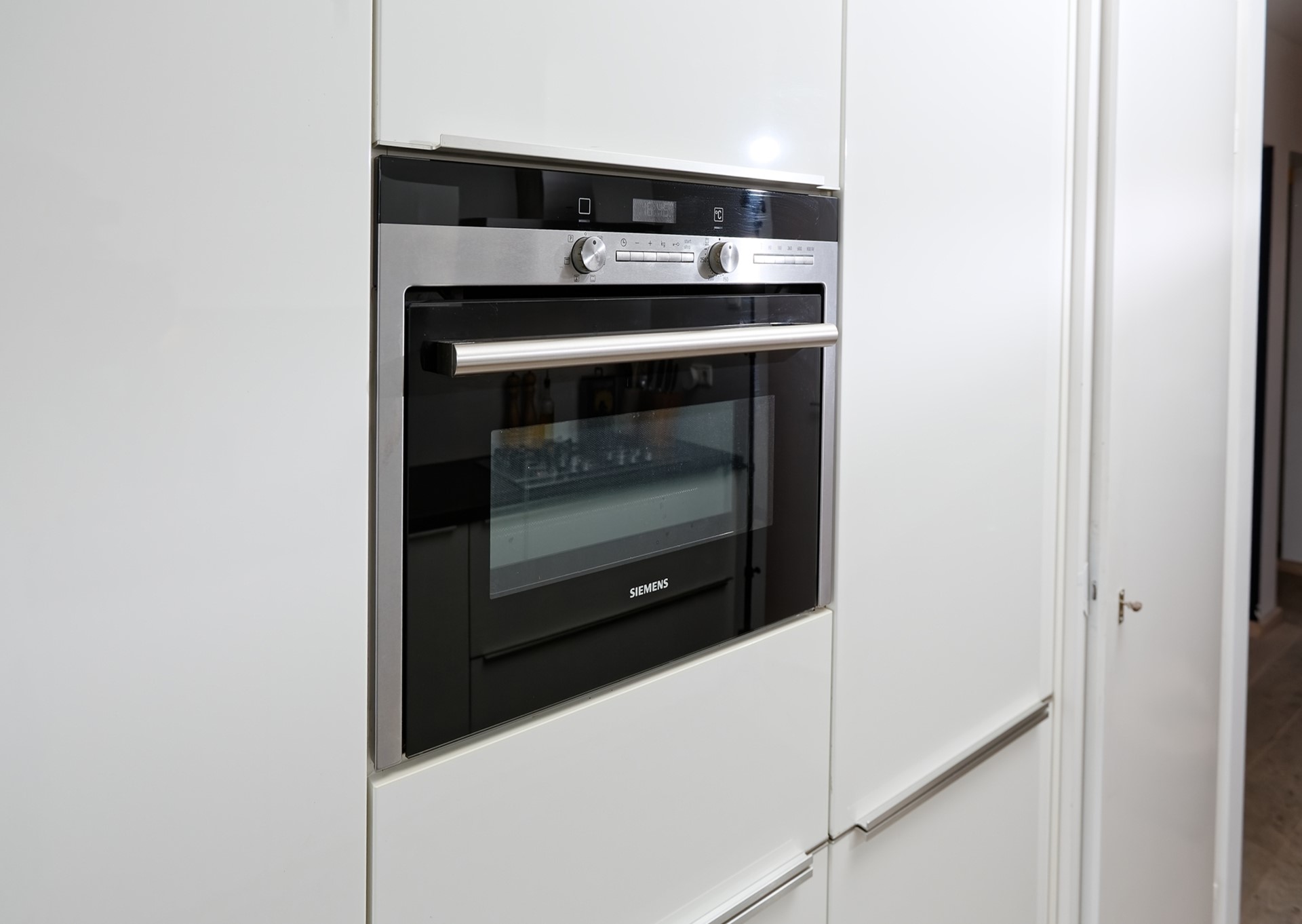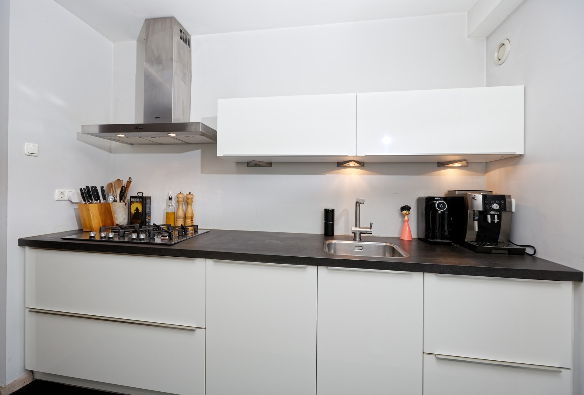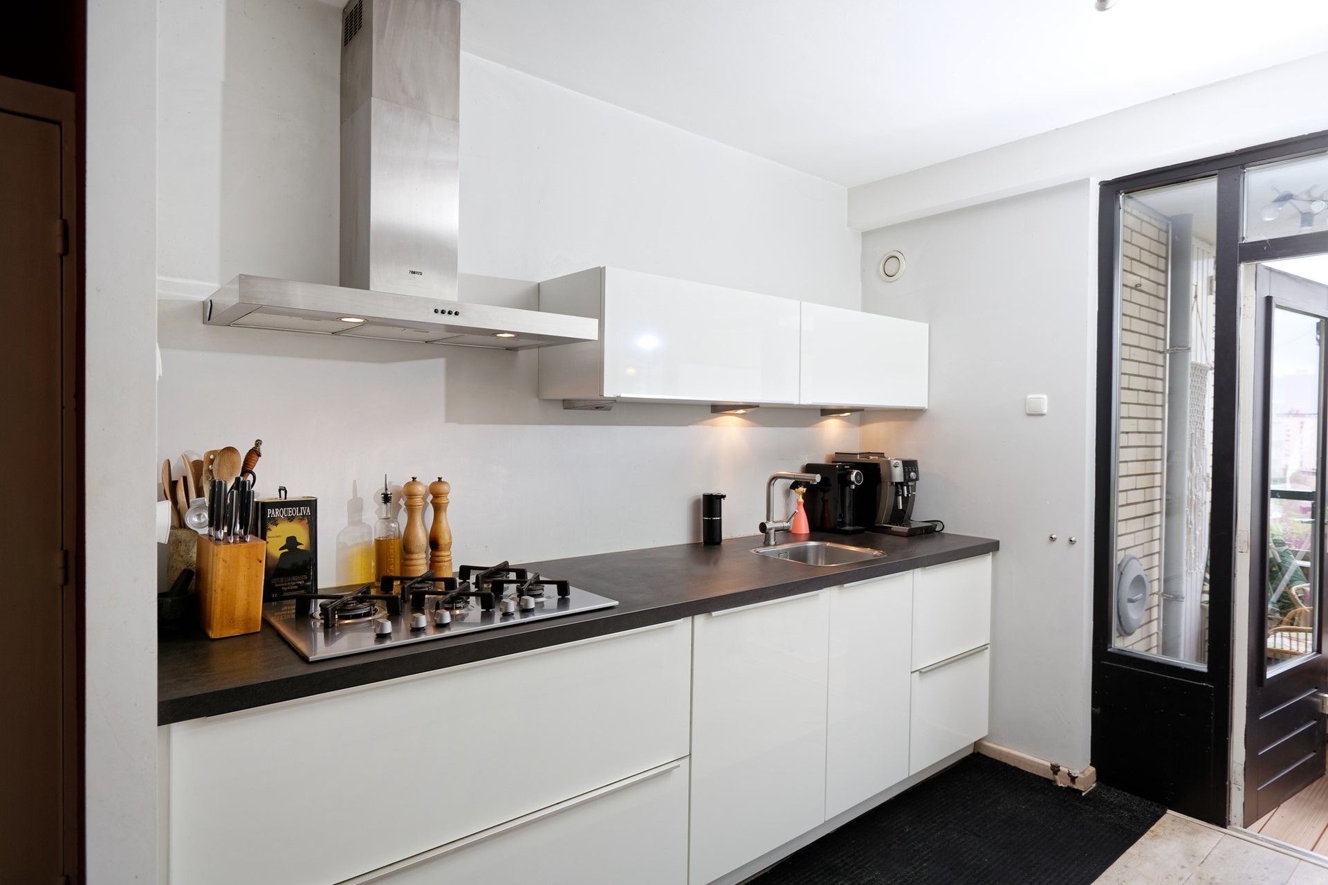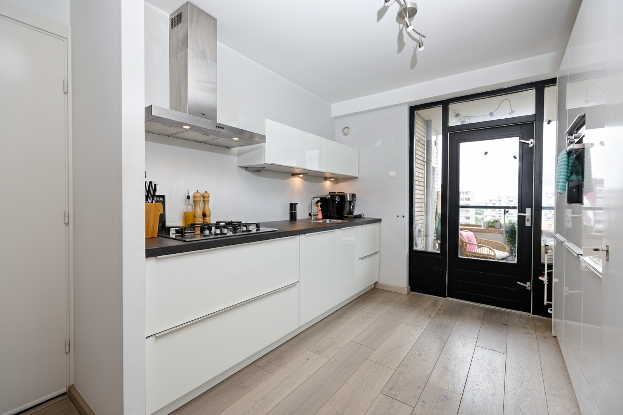 Vanuit het entree een open keuken, voorzien van twee lichte wandmeubels in parallelopstelling voorzien van luxe inbouw apparatuur w.o. een 5 pits gaskookplaat met afzuigkap, vaatwasser, koelkast-vries combinatie, een combi-magnetron oven en een voorraadkast. Vanuit de keuken hebt u ook toegang tot het balkon. De keuken heeft een oppervlakte van ca. 9 m².