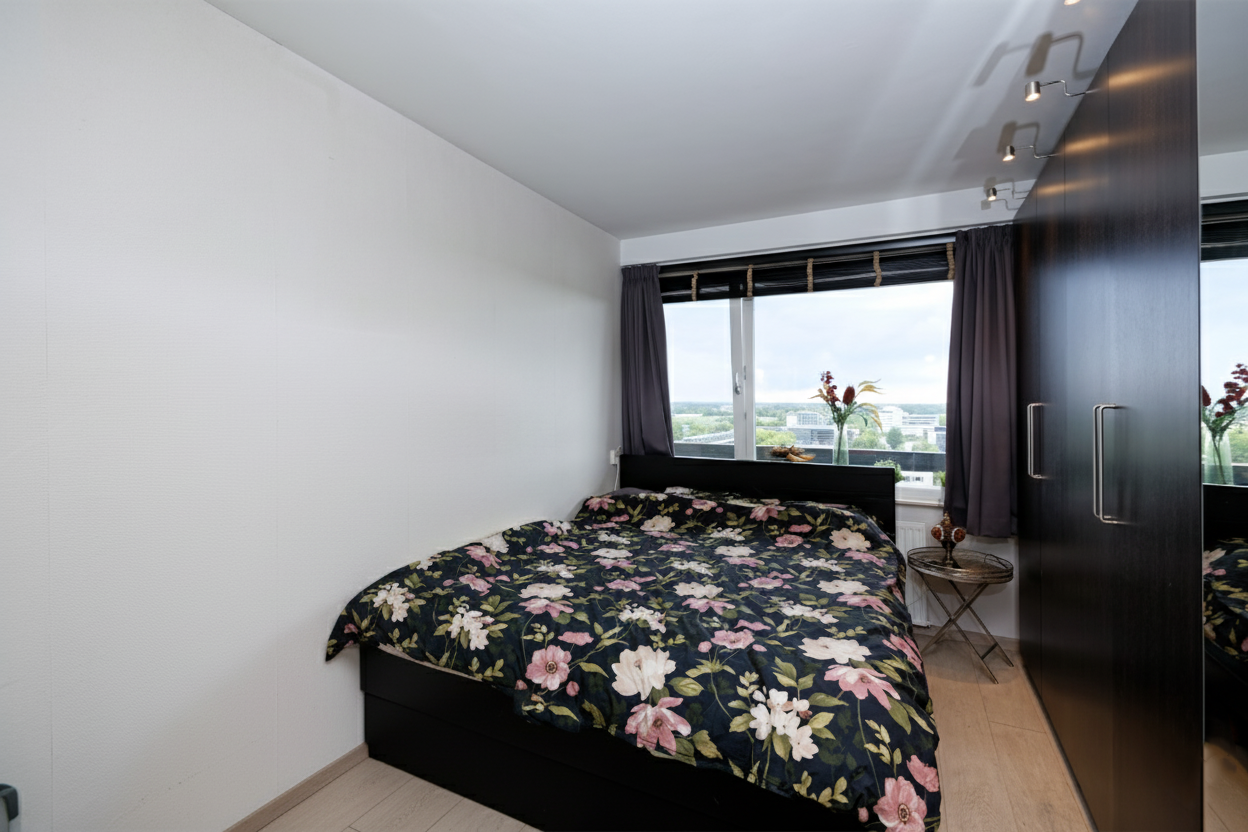 Het entree van het appartement ligt op de 12e verdieping aan een keurig verzorgd portaal, welke toegang geeft tot slechts twee appartementen. U kunt dus zonder naar buiten te moeten uw appartement betreden.
