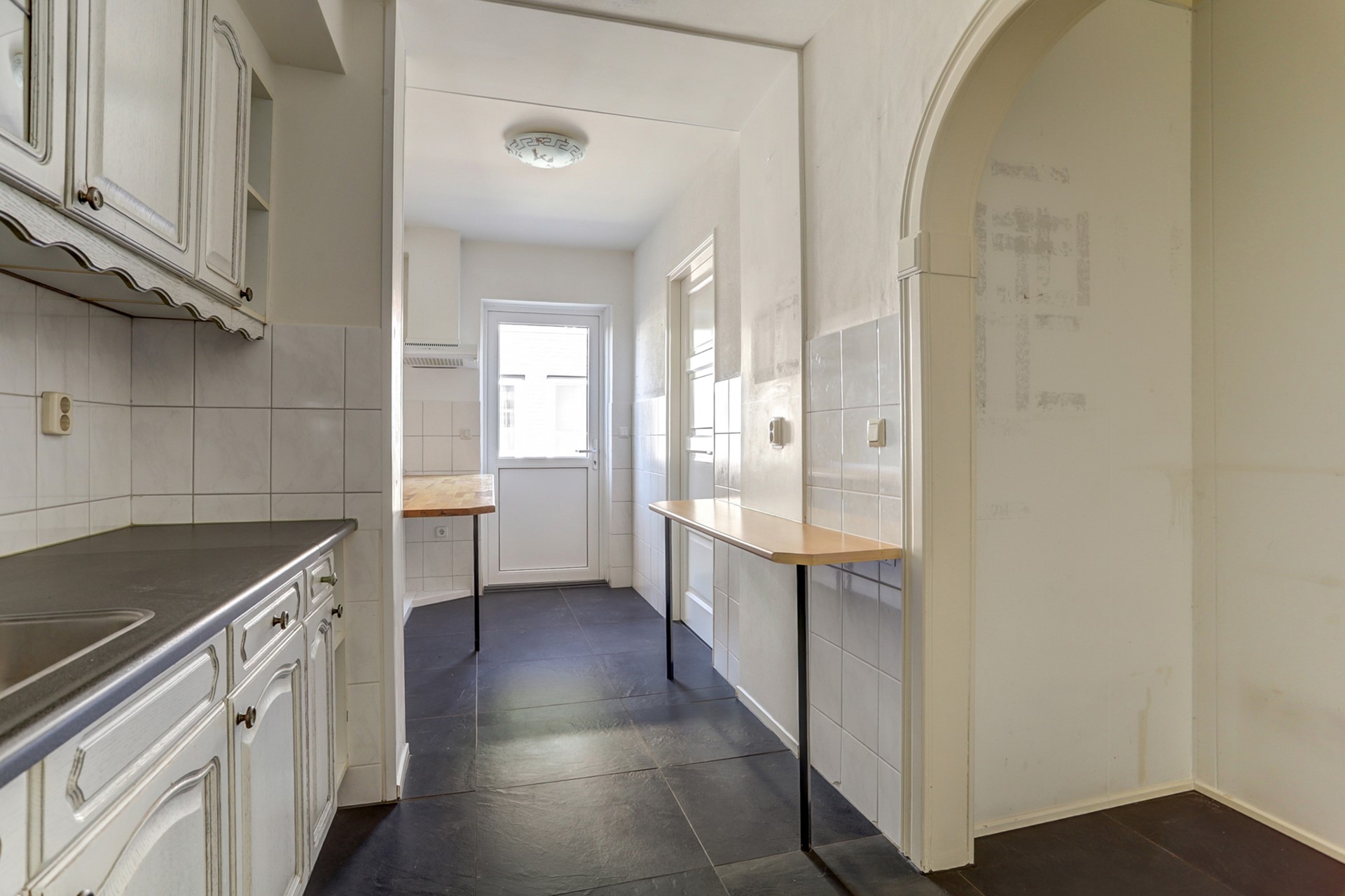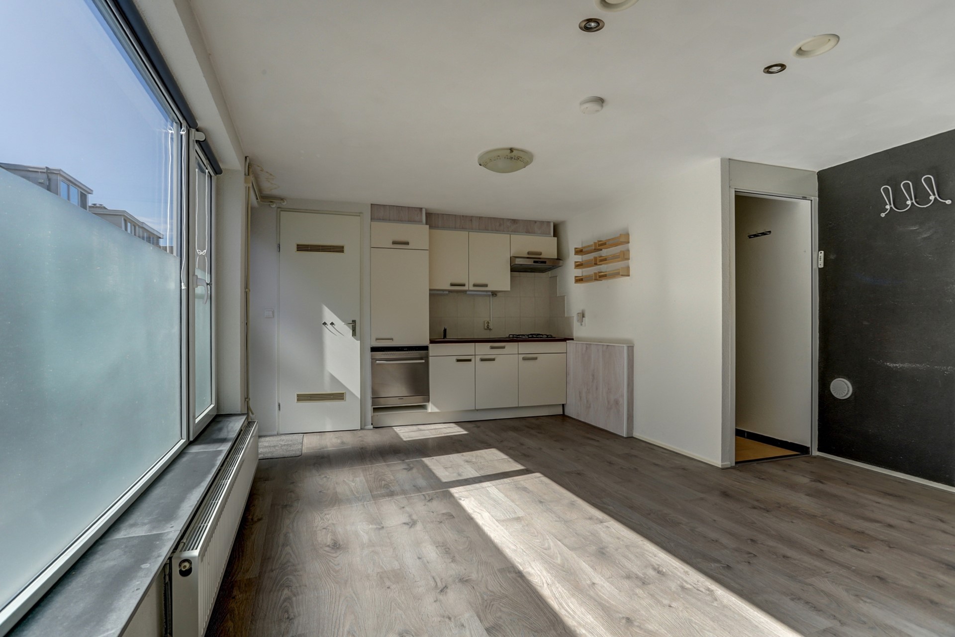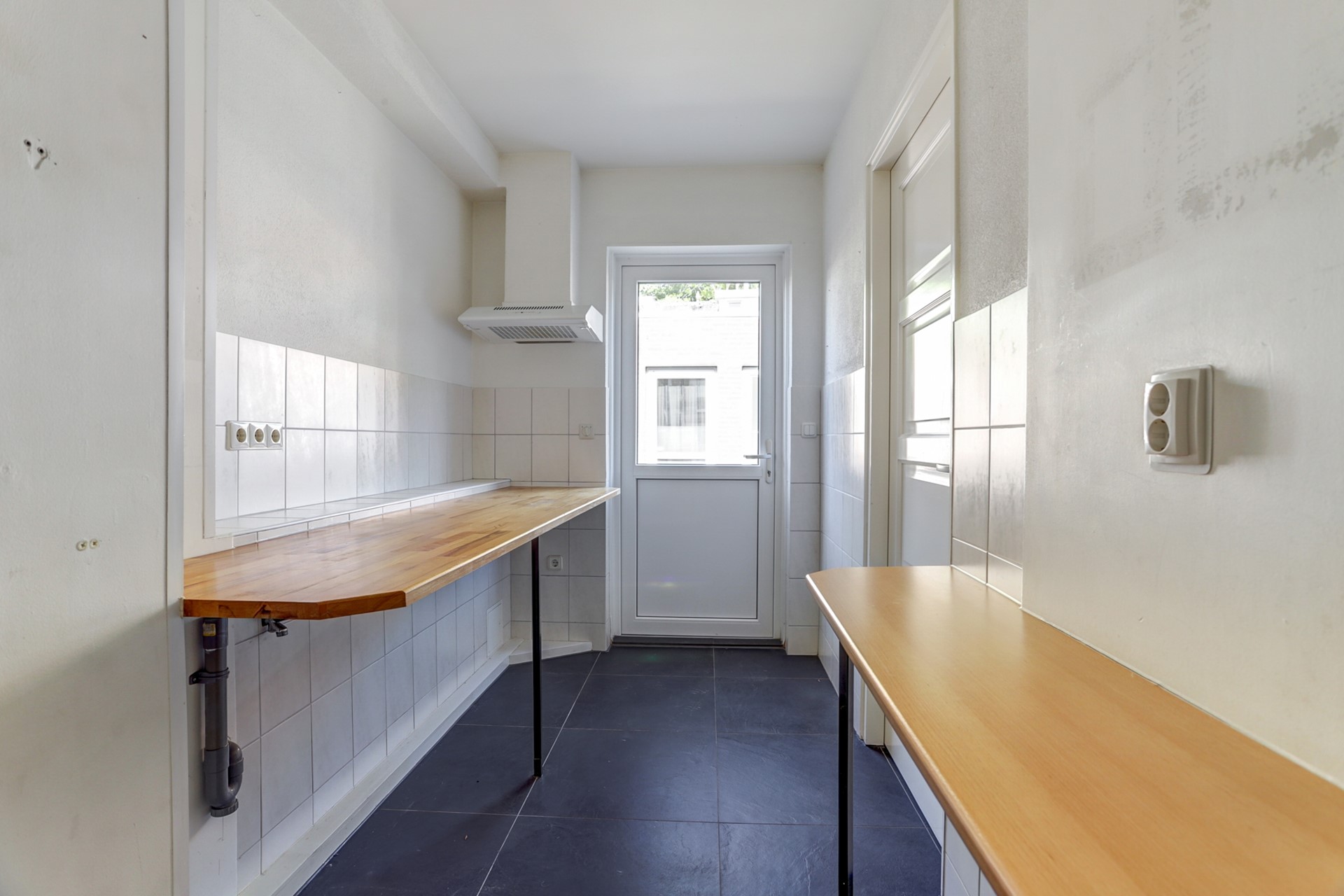 Het toilet is volledig betegeld en voorzien van een wandcloset, fonteintje en natuurlijke ventilatie. Toegang tot de royale uitgebouwde voorkamer met een oppervlakte van ca. 17 m² met aan de voorzijde een erker. De woonkamer is uitgevoerd met een prachtige donkere tegelvloer, gestucte wanden en plafonds. De achterkamer is uitgebouwd met een schuifpui met directe toegang tot de achtertuin opp. ca. 17 m². De voor – en achterkamer zijn gescheiden door een “lichte” wand die eenvoudig weg te halen is voor één grote lichte woonkamer. In het midden van de woning een royale keuken met een rechte opstelling van de keuken in een lichte kleurstelling v.v. elektrische kookplaat met afzuigkap, koelkast, oven en een royaal werkblad. Opp. ca. 12 m². Loopdeur naar de achtertuin.