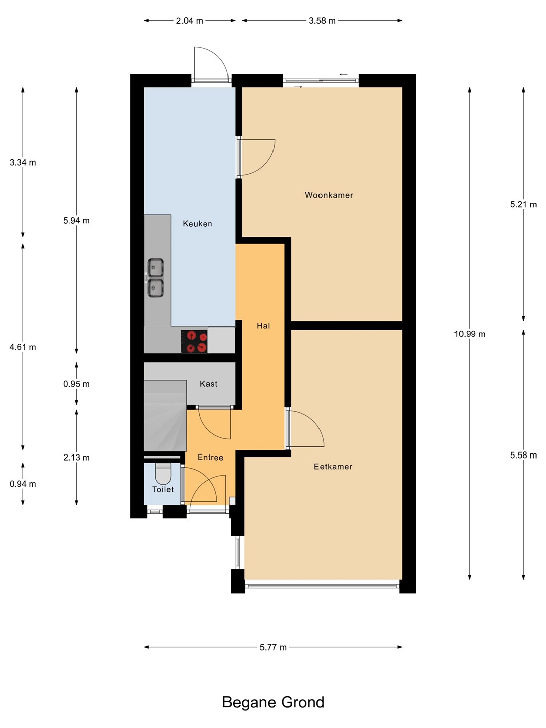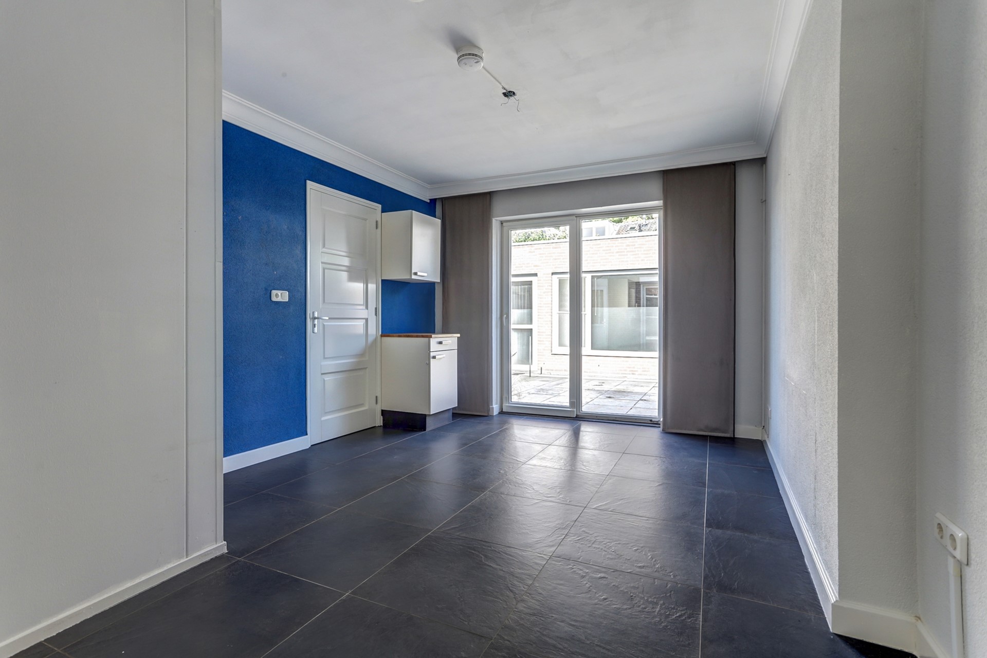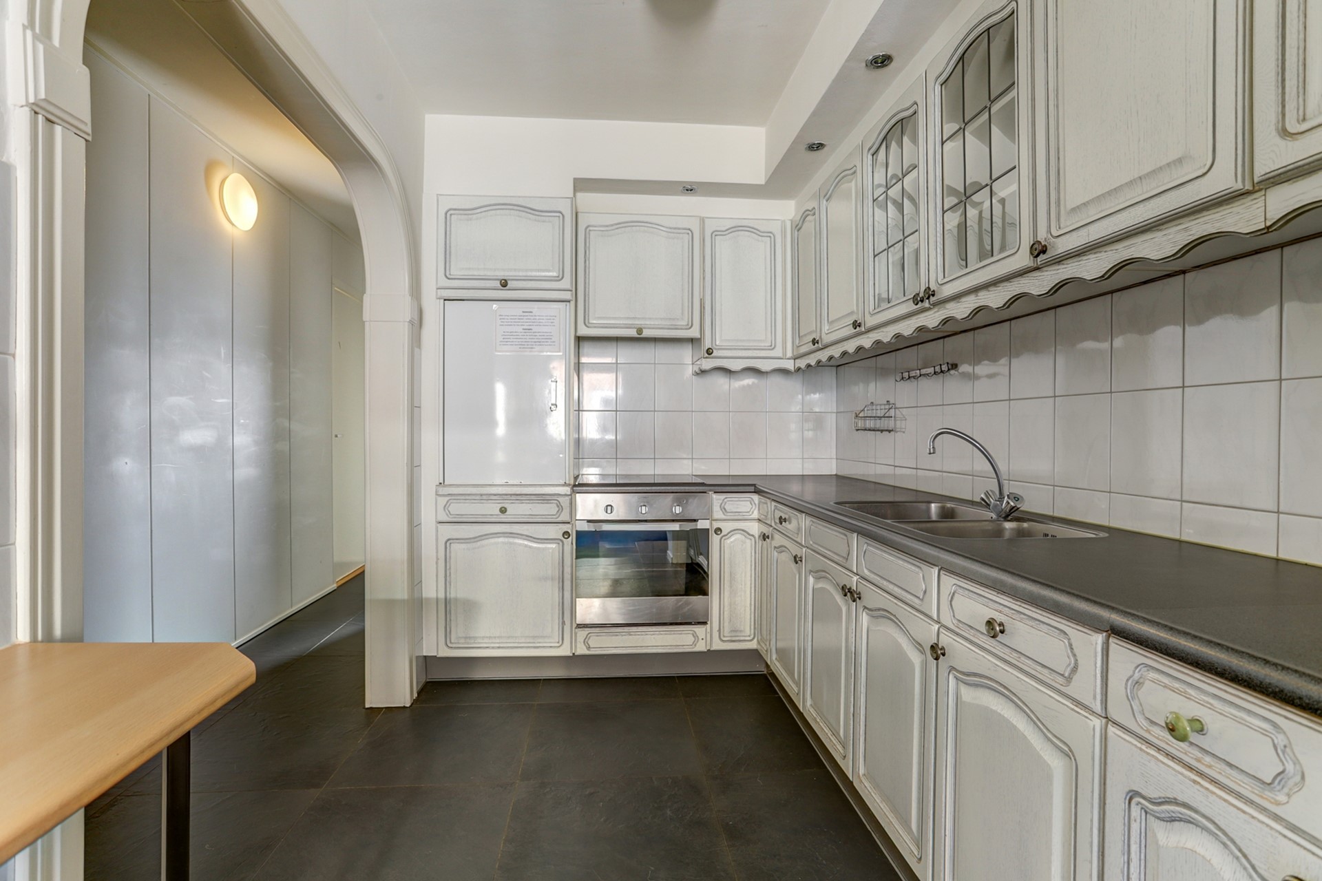 Het toilet is volledig betegeld en voorzien van een wandcloset, fonteintje en natuurlijke ventilatie. Toegang tot de royale uitgebouwde voorkamer met een oppervlakte van ca. 17 m² met aan de voorzijde een erker. De woonkamer is uitgevoerd met een prachtige donkere tegelvloer, gestucte wanden en plafonds. De achterkamer is uitgebouwd met een schuifpui met directe toegang tot de achtertuin opp. ca. 17 m². De voor – en achterkamer zijn gescheiden door een “lichte” wand die eenvoudig weg te halen is voor één grote lichte woonkamer. In het midden van de woning een royale keuken met een rechte opstelling van de keuken in een lichte kleurstelling v.v. elektrische kookplaat met afzuigkap, koelkast, oven en een royaal werkblad. Opp. ca. 12 m². Loopdeur naar de achtertuin.