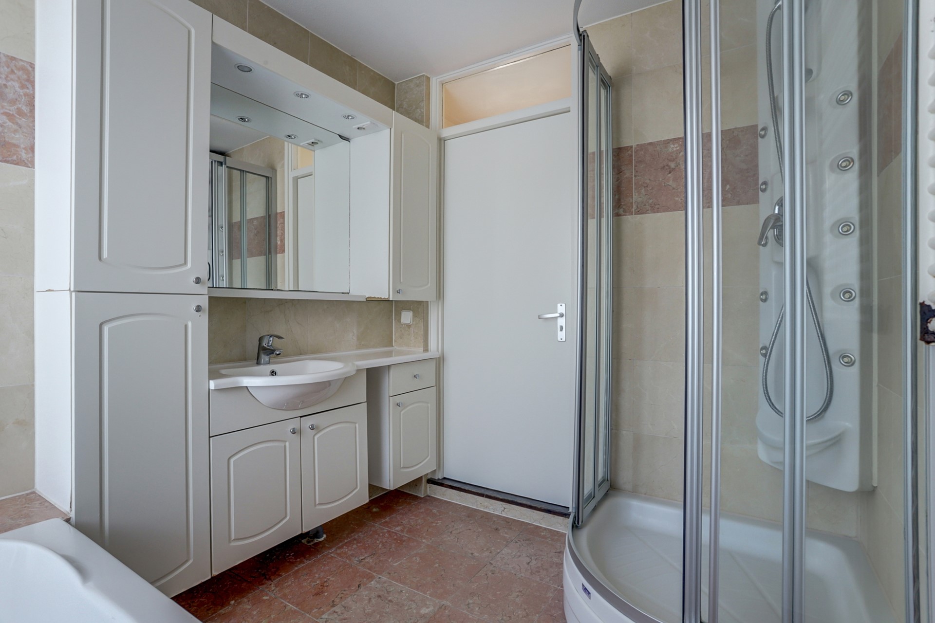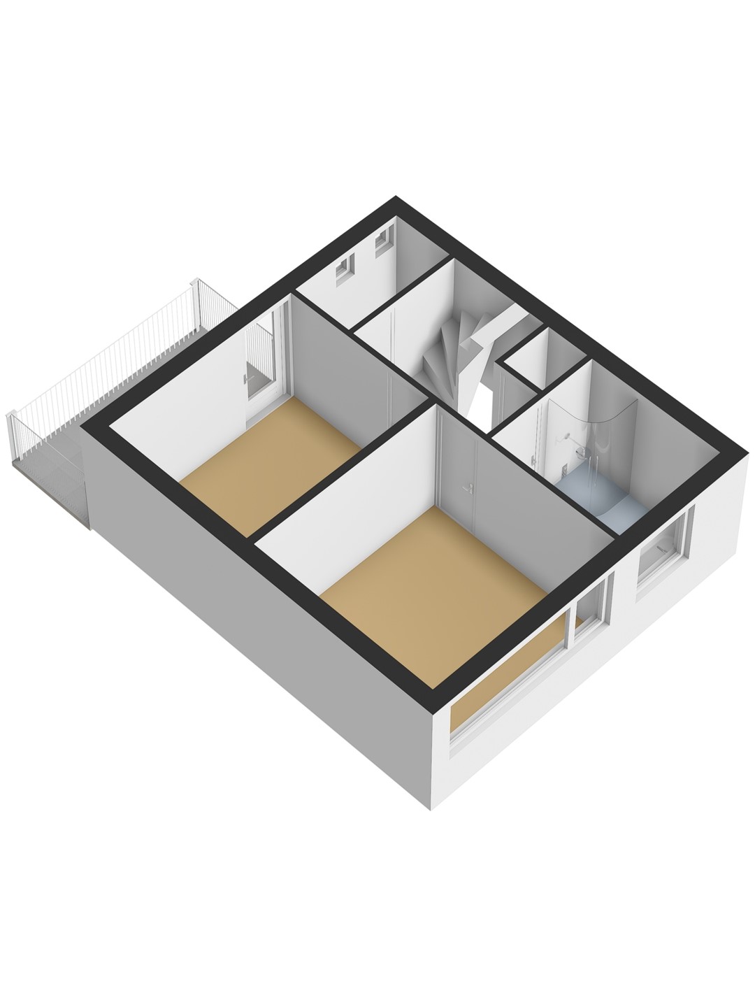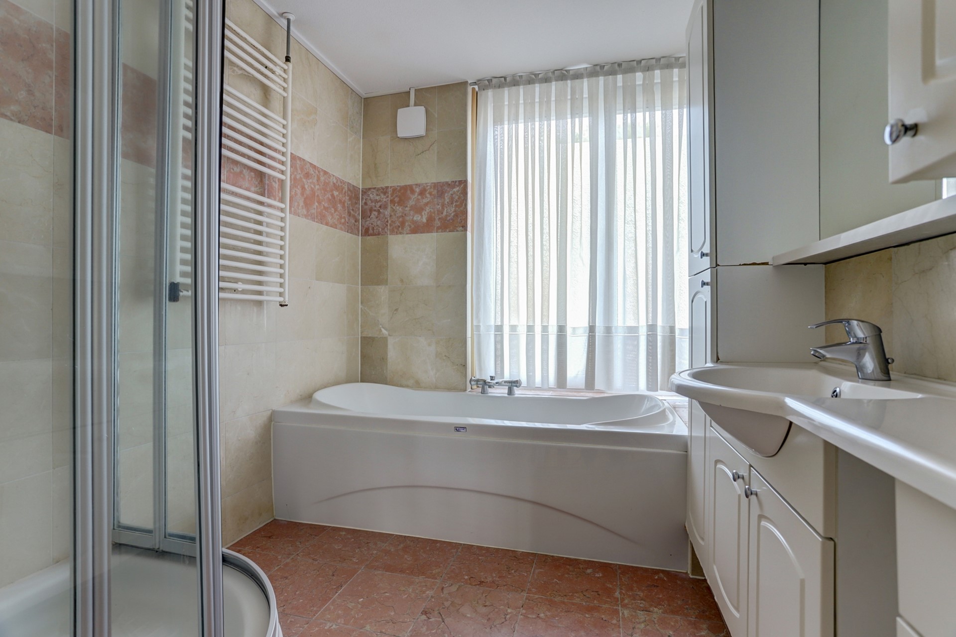 Vanuit de gang een vaste trap naar de eerste verdieping: de overloop geeft toegang tot 2 royale slaapkamers met resp. 12 en 10 m², waarvan één slaapkamer uitgevoerd met balkon. Badkamer met ligbad, wastafel, douchecabine opp. ca. 5 m². Separaat toilet en vaste kast.